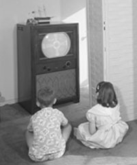 Various scenes of people watching television.